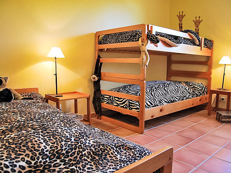 Huis 5-kamers 120 m2 op 2 verdiepingen. Hal. Woon-/eetkamer 36 m2 met open haard en TV (Flatscreen TV), stereo-installatie. Uitgang naar het terras. 1 kamer met 1 2-pers bed. Keuken (4-pits kookplaat, oven, afwasmachine, magnetron, diepvriezer, elektrische koffiemachine). Douche, aparte WC. Bovenverdieping: 1 kamer met 1 2-pers bed (140 cm, lengte 190 cm). 1 kamer met 2 bedden (80 cm, lengte 190 cm). 1 kamer met 1 bed (80 cm, lengte 190 cm), 1 x 2 stapelbedden (80 cm, lengte 190 cm). Badkamer, aparte WC. Terrasmeubelen. Ter beschikking: wasmachine, droger, kinderstoel, kinderbed. Internet (WiFi). Garage op het terrein (1 Auto). Rookmelders, brandblusser.
