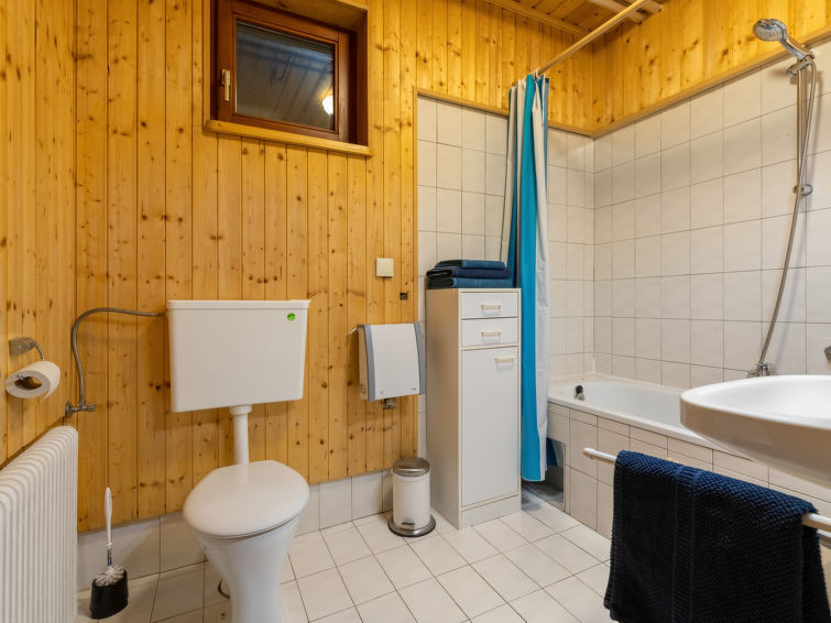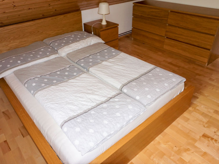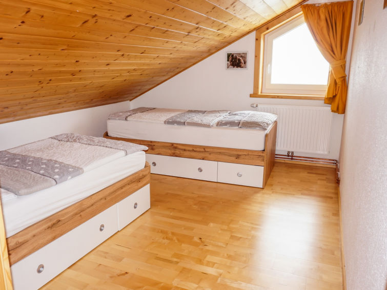 "Pistenblick", huis 6-kamers 180 m2 op de 3e verdieping. Ruim, gedeeltelijk afgeschuinde daken, comfortabel ingericht: hal. Woonkamer met wintertuin. Uitgang naar het balkon. 1 2-pers. kamer. Keuken (oven, afwasmachine, 4 keramische glas kookplaten, magnetron, diepvriezer) met eettafel. Douche, aparte WC. Souterrain: (buitentrap) hal. 1 kamer met 1 2-pers bed (140 cm, lengte 200 cm). Woon-/slaapkamer met 1 2-pers divanbed en Sat-TV. Keuken (afwasmachine, 4 keramische glas kookplaten) met eettafel. Bad/WC. Bovenverdieping: (wenteltrap) doorgangskamer met 1 2-pers bed (140 cm, lengte 200 cm). Open, 1 2-pers. kamer met 2 bedden (90 cm, lengte 200 cm). 1 kamer met 1 x 2 stapelbedden (90 cm, lengte 200 cm), 1 2-pers bed (180 cm, lengte 200 cm). Badkamer, aparte WC. Ruime zithoek in de tuin. Terrasmeubelen. Mooi uitzicht op de bergen en het dal. Ter beschikking: Internet (WiFi, gratis). Parkeerplaats bij het huis. Geschikt voor families. Niet rokers woning.