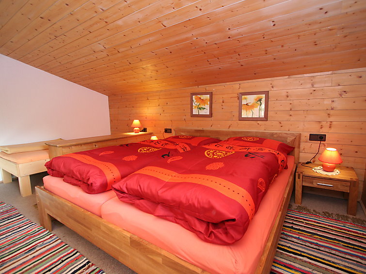 Appartement 4-kamers 90 m2, op de bovenste verdieping. Gedeeltelijk afgeschuinde daken, gezellig ingericht: hal. 1 kamer met 1 x 2 stapelbedden. 2 kamers, elke kamer heeft 1 bed en 1 2-pers bed. Groot woonkeuken (oven, afwasmachine, 4 keramische glas kookplaten) met 1 divanbed, zwedenkachel, eethoek en Sat-TV (Flatscreen TV), radio. Uitgang naar het balkon. Douche, aparte WC. Groot balkon. Balkonmeubilair. Mooi panoramazicht op de bergen, het dal en het landschap. Ter beschikking: haardroger. Internet (Internet (WiFi), gratis). Geschikt voor families. Rookmelders.